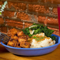 “ Fantastic and delicious vegan comfort food. Portions quite large for the price. Gluten free options available too. The upstairs of this restaurant is airy, artsy, and cool. You order at the counter then seat yourself. Delicious kombucha on tap (the sovereign peach ginger might be the most delicious kombucha I've ever had). The food was all so tasty that i recommend going with a group so you can try all the things! Highlights: the buffalo cauliflower special was phenomenal. If they have it, get it. The bowl with the mashed potatoes and gravy was so soothing and wonderful. The curry is also a standout. ”